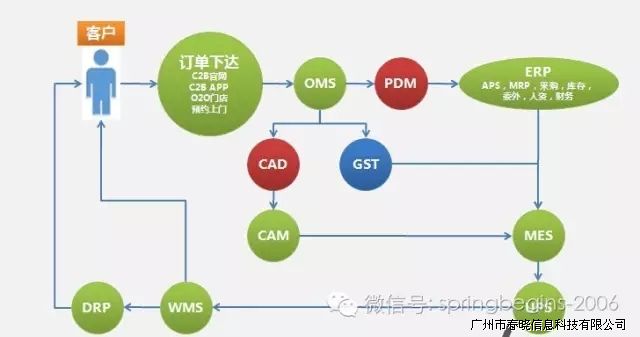一般来讲,大规模个性定制业务分为四个阶段,分别为:下单、准备、生产、交付。而这每个阶段的平台搭建很重要,例如:订单下达,客户管理、计划、物料、采购、人资、财务、打版、工艺、裁剪、生产、仓储、物流等。同时,每个平台的互通链接很重要。大多数企业都有一些管理系统,但没有做到有效的整合,久而久之,形成了 个信息孤岛。而整个“智慧型工厂”的建设需要企业内各系统之间的统一性与有效整合。形成基于信息化的自动化、一体化、精益化、集成化的信息平台。